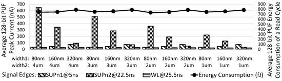 Phase I SUPPLY transistor widths of 80 nm to 320 nm and phase II SUPPLY transistor widths of 1 m to 4 m were picked to evaluate various combinations of two-phase power gating. Figure 6 illustrates the comparison of the current peaks of different signal edges in different combinations of SUPPLY transistors whilst power gating a 128-bit PUF. It can be seen that a higher power-up current corresponds to a larger SUPPLY transistor. The phase II current also relates to the vddv value at the start point of phase II. The energy consumption of a PUF cell for each reading cycle exhibits minimal variation, i.e., from 5.7 fJ to 6.2 fJ. These adjustable power-up currents can limit the in-rush current and be exploited further as a candidate against side channel attacks. In our design, the SUPPLY transistor combination of 80 nm for PM4 and 4 m for PM5 is implemented to emphasise the prolonged PUF metastability-resolving process and the rapid reset process.