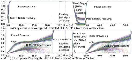 The 128-run Monte Carlo simulation results illustrate the different power-up and reset behaviours of PUF cells, as shown in Figure 7. In Figure 7a, with a 4 m width SUPPLY transistor, the vddv of single-phase power gating reaches 1.2 V in roughly 1 ns, whilst quickly resolving the metastability of inside node pairs, i.e., Data and DataN. In contrast, Figure 7b illustrates that vddv reaches around 0.7 V in 5 ns and lingers for about 4 ns, then gradually climbs up towards 1.2 V at phase I power-up with the SUPPLY transistor width of 80 nm. Following this, with a 4 m width SUPPLY transistor, phase II starts from 22.5 ns and swiftly increases vddv to 1.2 V in around 1 ns with the help of the 80 nm SUPPLY transistor. It can be seen that the low start-up voltages in phase I lengthen the metastability resolving time of 8T PUFs. Simultaneously, Data and DataN start wrestling while vddv is ramping up slowly, then escape out of metastability and tend to their distinct logical status in various resolving times due to their intrinsically varied physical parameters. These opposite tendencies of Data and DataN resemble the random PUF behaviour in real circuits.