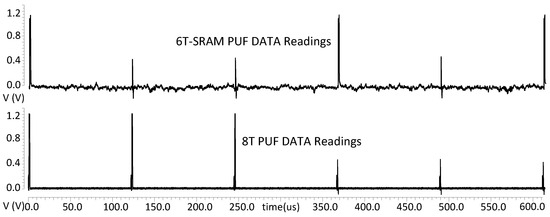 Without resetting thoroughly, the assessment of the PUF characteristics can be misguiding. One piece of evidence is that with the data remanence, the under-reset 6T-SRAM PUF readings do not change in more than 200,000 runs of a Monte Carlo simulation compared to the 8T PUF. This creates a deceptive deduction that the 6T-SRAM PUF cells are 100% stable in nominal conditions [57]. However, if the reset time duration is prolonged to 120 s with 65 nm technology, the simulation results show that the stability of the thoroughly reset 6T-SRAM PUF will be affected in the same way as the 8T PUF, as illustrated in Figure 8. Long duration transient simulations were conducted with intensified noise. In these simulations, the 8T PUF cell, with the help of two discharging NMOS transistors, can reset two internal data nodes to the absolute values below 10 mV within 1 ns, while the 6T-SRAM PUF can barely achieve the same reset level even in 100 s.