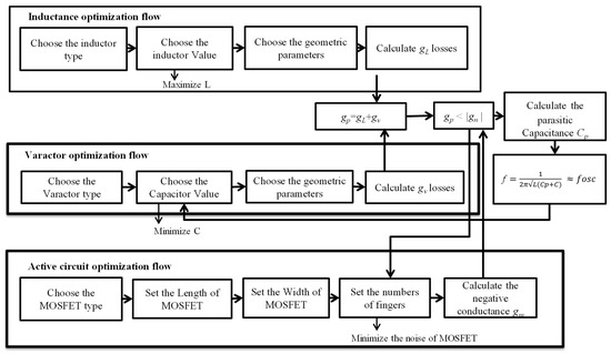 The merit of paper is to design an ultra-low-power VCO. The design methodology emphasizes the importance of optimizing each component of the VCO to meet the required performance parameters. By optimizing the inductor, varactor, and active circuit, it is possible to enhance the VCO’s phase noise and power consumption efficiency overall. The design flow is to be considering a part of optimizing the overall design of the VCO. To improve the design, three key considerations have been taken into account, as is shown below in Figure 2. To reduce the resistive loss (gL) and increase the quality factor, the inductor must first be tuned, after which the varactor needs to be optimized, and then the active circuit needs to be optimized.