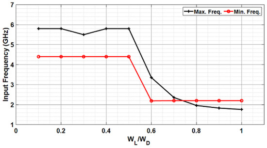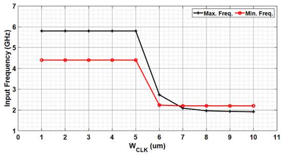 Figure 5 shows the transistor’s clock width (WCLK) response concerning the divider’s input frequency range. At high frequencies, it is critical to optimize the energy linked to the common source node for a certain externally injected signal. The transistor’s clock size and biasing have an important role. For a particular size of the clock transistor, a specific common-mode value produces the maximum self-oscillating frequency [25]. A constant WL/WD ratio is used to simulate the response, and it is evident that the divider works at high input frequencies for small-size MCLK transistors such that (4.4–5.8 GHz @ 1 µm). Comparatively, as the MCLK transistor size increased, the input frequency range became narrower such that (1.9–2.2 GHz @ 10 µm).