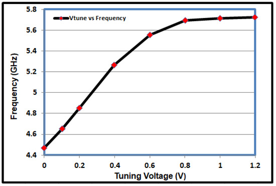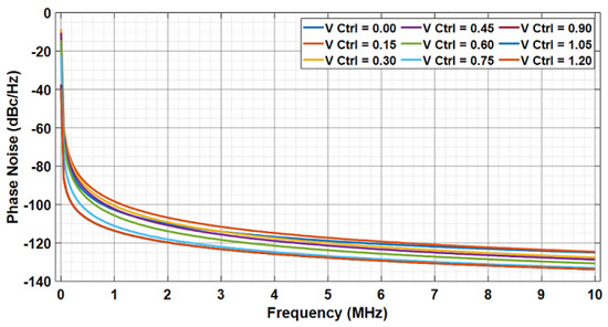 As depicted in Figure 6, the phase noise efficiency improved when the control voltages of the VCO were increased from 0 V to 1.2 V.