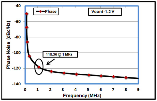 The lowest phase noise of −118.36 dBc/Hz at 1 MHz offset is achieved at the carrier frequency of 2.4 GHz and a control voltage of 1.2 V, as depicted in Figure 7. The proposed VCO design achieves low phase noise performance by minimizing the effects of flicker noise and optimizing the control voltages. The results show that the VCO design is effective in achieving the required phase noise characteristics, rendering it appropriate for use in a variety of applications, including low IF receivers, wireless sensor networks, and direct conversion receivers.