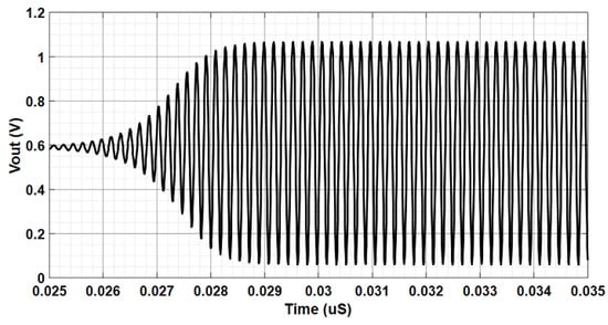 The quadrature differential cross-coupled VCO and divide-by-two frequency divider’s output frequencies may be adjusted between 4.4 GHz and 5.7 GHz, as depicted in Figure 8, where, at minimum control voltages, the frequency is low, i.e., 4.4 GHz, and as the voltages increase, the VCO exhibits a high frequency, i.e., 5.7 GHz. These characteristics of the VCO make it tunable. By changing the variable capacitor’s control voltage, the frequency of oscillation may be tuned. The VCO takes around 29 ns to attain a steady amplitude. The time domain output of the designed LC-VCO is present in Figure 9.