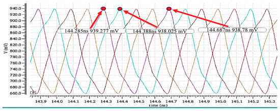 Furthermore, the most precise quadrature LO signals across a broad frequency range are produced using a double-frequency VCO using a 1/2 frequency divider technique. In this article, a LC tank complementary cross-coupled differential voltage-controlled oscillator (VCO) with master-slave D flip-flops is used to achieve perfect symmetry between the quadrature outputs of an oscillator. This technique addresses the intrinsic asymmetry issue in current reusing and ensures an accurate quadrature phase relationship, leading to improved performance in RF transceivers. To design ZERO-IF receivers, this solution should be preferred because it avoids direct parasitic coupling between the VCO and receiver input. Figure 10 exhibits the quadrature output waveform in the time domain of the proposed VCO with a frequency divider in post-layout simulation.