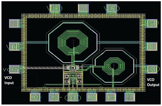 The layout area of the presented CMOS VCO and frequency divider architecture in this article occupied a small active area of 0.19 mm2 of the chip without a pad and 0.47 mm2 with pads. Figure 11 shows a chip photograph of the proposed LC-VCO. The design presented in this article is simulated with the TSMC 65 nm CMOS technology with 1 poly and 9 metals.