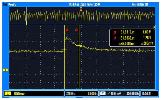 The most important metric in Table 2 is the power-per-synaptic-operation, as it measures not only the power of a single spike, but also the power the STDP circuit consumes during operation of a single node of the network []. Without individual testing structures and input/output pins for the fabricated chip for the STDP and neuron by themselves, the power metric was calculated by measuring the current drawn by the circuit in the test setup alongside the voltage levels seen from the waveforms. This measurement was divided by the number of operations during the testing period to obtain the power per operation statistic, seen in Table 2. From this result, it can be seen that as the number of synaptic connections increased, reasonable accuracy could feasibly be achieved using the proposed cell. To realize such a large number of neurons, the addressed event representations are needed to communicate between the large numbers of neurons [,,]. To implement such a system, memory, a communication protocol, and digital-to-analog interfaces would need to be constructed, which is outside the scope of this initial work.