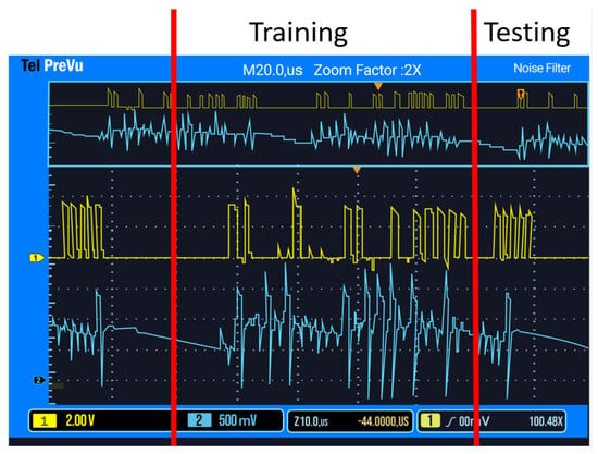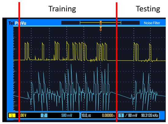 The primary concept of this test (Figure 2) is to train the SNN on group one data, and then test the network on group two data (Figure 3). As the network was trained on group one data, the group two data should not cause the network to produce an output spike. The yellow waveform shows the micro-controller spikes, while the blue waveform shows the network’s response. For the first four training spikes, no spike was observed, as expected, and the last spike produces an output showing that the weights have become accustomed to the trained data. For the second test, the SNN was trained using group one data, the same data it was tested on previously. The SNN should, therefore, spike often, demonstrating it is accustomed to the learned data. Accuracy is measured by sending ten training pulses from a given group, and then one random pulse from either group, with the accuracy percentage measuring how often the SSN “guessed” correctly whether to spike or not in response to the single random spike.