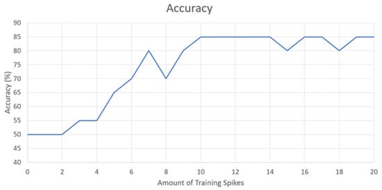 The main test for this work is to demonstrate just how well the SNN architecture can learn patterns in data. To do this, a certain amount of training Group 1 spikes was given to the network followed by one test data point of either Group 1 or Group 2. For each number of training spikes, the test was performed 20 times and randomly given 10 Group 1 data points and 10 Group 2 data points. If the SNN thinks the tested data point is Group 1, it will produce a spike; and it will produce no spike if it thinks it is Group 2. The following graph in Figure 4 shows the results of this experiment.