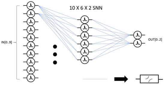 A shallow, strictly feed-forward SNN of an input layer, a single hidden layer, and an output layer is used to demonstrate the functionality and efficiency of the developed SNN cell. The number of neurons per layer is shown below in Figure 5, where each blue line represents an individual synapse to record the activity between neurons. The neurons themselves are represented by circular symbols with a spike in the middle.