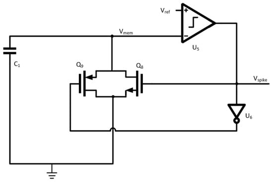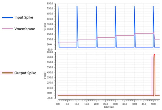 The leaky integrate and fire neuron imitates the functions of the soma, dendrites, and axons of a biological neuron []. Input spikes are accumulated on the captive membrane node, Vmem in Figure 6. After the charge rises above the threshold set by Vref (250 mV), the LIF provides an output signal via a comparator designed to provide a biologically similar spike [] with a hysteresis of 50 mV. After firing, the membrane is depleted to its resting potential of around 100 mV.