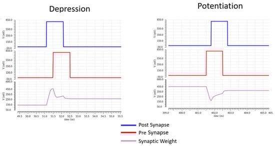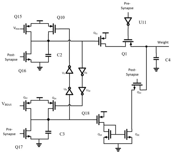 The circuit proposed for the synaptic connection must only change its weight value, held on capacitor C4, when both neurons before and after it in the SNN architecture fire. In Figure 10, the top (mirrored on the bottom) structure formed by Q10, Q15, Q16, and C2 is an integrator holding the spike’s value. One integrator holds the value of the pre- or post-synaptic spike, simultaneously activating a buffer that disables the other integrator, so it does not disturb the circuit functionality. Additional transistors are added to assist in the depression of the weight capacitor value, increasing the speed at which the SNN learns by responding more quickly to uncorrelated spikes [].