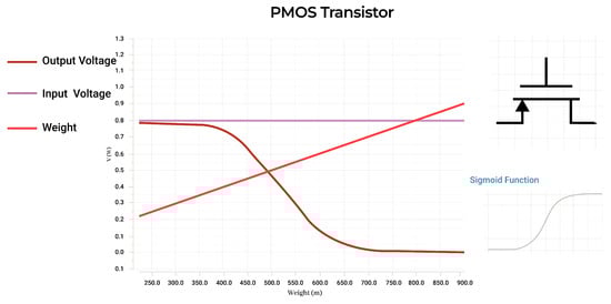 A sigmoid or logistics curve is a common activation function used for machine learning applications that a PMOS transistor’s transfer function resembles. This non-linear activation function can be realized in a variety of ways, the most efficient of which was found to be a single PMOS with the weight function applied to the gate. The STDP circuit operates with a voltage range of 0 V to 600 mV, and the designed PMOS covers this range to 100–800 mV allowing for the neuron’s recorded values to be kept in a range well-suited for the architecture. Figure 11 details this functionality.