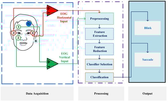 The eye can be considered a dipole, having its positive and negative poles at the cornea and retina, respectively [8]. The eye has a steady corneo-retinal potential generated within the eyeball by the metabolically active retinal epithelium. The potential can be measured by placing electrodes on the skin surface around the eyes, which is referred to as the electrooculography technique. This technique provides electrooculograms (EOGs), which represent the recording of eye movements. The amplitude of EOG varies in the range of 50–3500 microvolts (µV). The frequency range of EOG is 0–30 Hz [10]. EOG is non-invasive, consistent, and inexpensive [10,11]. EOG can contain either horizontal data or vertical data, and in some cases, both depending on the electrode configuration of data acquisition. Nowadays, modified elctrode configuartion [29], eyeglasses [20], EOG sensors [30], optical sensors [31], and contact lenses [32] are also available for EOG data acquisition. The EOG data suffers from some noises that introduce inaccuracies in diagnosis and other applications. These noises include power line interference, baseline wander, etc. For any biomedical application of EOG, the efficient removal of the noise from the EOG signal is necessary. After the removal of the noises, these denoised signals can be sent for further processing. EOG has a wide range of applications in various fields, such as medical diagnosis, ophthalmic Research, and human-machine interface (HMIs), etc. EOG has a great impact on the development of HMI, as EOG is the primary tool for eye movement analysis. EOG helps to detect various eye movements such as blinks, saccades, and fixation.