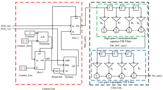 Figure 3 depicts the block diagram of the preprocessing subsystem. It consists of a control unit (red) and a filter unit (black). The control unit takes horizontal data EOG_h(i) and vertical data EOG_v(i) as input and passes sequentially to the filter unit using a multiplexer, Mux 1. The output of the control unit Mux_out(i) is given as input for the filter unit. The control unit block has two up counters: Counter_Slow and Counter_Fast. These counters work at 256 Hz and 2.56 MHz, respectively. The random-access memory (RAM) block stores the vertical data while horizontal data is preprocessed in the filter unit. The vertical data stored in the RAM is passed sequentially. Multiplexer 2 generates addresses for the memory block, RAM.