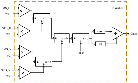 Figure 6 shows the FPGA implementation of the SVM classifier. It can be translated in hardware using (10).