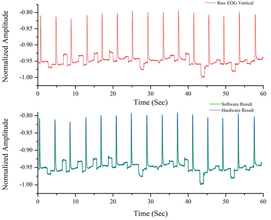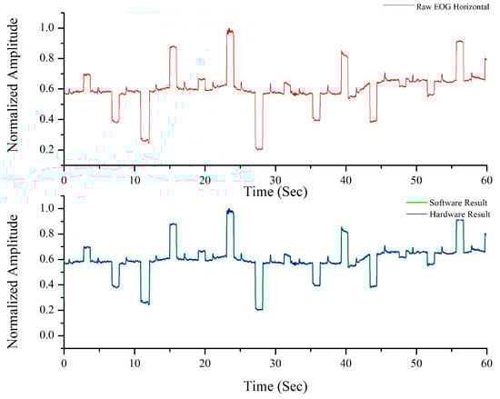 This section demonstrates software and hardware results. Figure 7 and Figure 8 show input and superimposed software-hardware results for only subject . In both figures, the data are represented in normalized form.