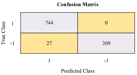 Figure 9 depicts the confusion matrix of the binary classifier. The number of true positive (TP), false positive (FP), true negative (TN), and false negative (FN) cases is 744, 27, 309, and 0, respectively. Here, TP represents the cases where a blink is detected as a blink, FN represents the cases where the blink is detected as a saccade, TN represents the cases where a saccade is detected as a saccade, and FP represents the cases where a saccade is detected as a blink.