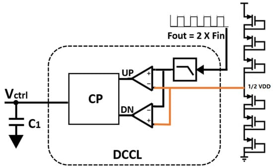 The DCCL ensures a 50% duty cycle of the output on all PVT corners. It controls the delay of VCDL using the signal Vctrl. The feedback forces the average (i.e., DC component) of the 2× signal to be equal to half of the VDD to achieve a 50% duty cycle. To save power and area, diode-connected stacked PMOS devices are used. The stacked MOS diodes generate a VREF equal to half of VDD. A passive RC integrator extracts the DC of the 2× signal and compares it with VREF using OTAs, as shown in