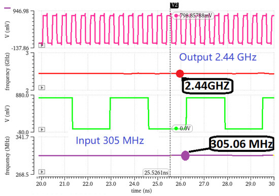 Figure 10 shows the post-layout performance of the 8× frequency multiplier. Here, 305 MHz is given as input frequency to the multiplier, which generates an output frequency of 2.44 GHz.