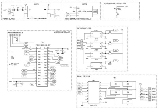 The control system is based on a PIC24FV32KA302 microcontroller. The main control circuit based on the aforementioned microcontroller is presented in Figure 1. The control circuit consists of a 24 V power supply unit, a DC/DC to 5 V converter. A USB-COM module is used to transmit the control signals. A 5 V supply voltage indicator is also used. The main microcontroller consists of 28 pins. A certain group of contacts controls the electronic switching relays. There are also dedicated contacts for data packet communication, power supply and programming.