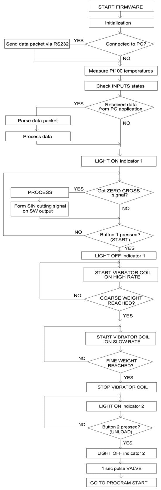 As already mentioned, a PIC family microcontroller was used to control the vibratory dosing system. The control program for the microcontroller is written using the programming language C. A block diagram of the algorithm for this program is presented in Figure 5.