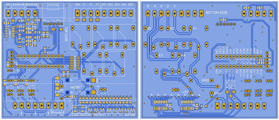 For the implementation of the vibratory dosing system, a printed circuit board (PCB) was designed and manufactured, the general view of which is presented in Figure 6. One side of the PCB is for connecting the microcontroller and other additional components, and the other side of the PCB is for connecting the boost registers and fast electrical contacts. In addition to the microcontroller, the printed circuit board has designed spaces for active SMD elements such as capacitors, diodes, etc. The PCB is manufactured using double-sided PCB manufacturing technology. The wiring tracks of the printed circuit board are made of copper layer. In order to prevent the copper tracks from oxidizing, the surface of the PCB was covered with a special dielectric material protecting it from environmental influences. In order to produce a PCB with the smallest possible geometric dimensions, optimization was carried out, which reduced the number of copper tracks and shortened their length.