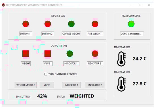The accurate dosing of production is intricately tied to the precise control of the vibratory feeder system’s frequency and the modification of the sinusoidal voltage signal. For optimal functionality of the dosing system, maintaining consistent operating parameters, including vibration frequency and signal percentage area, is paramount. The system management application incorporates an active window that provides a real-time display of key technological process values. These values encompass critical metrics such as the temperature of the electromagnet and the percentage modification of the sinusoidal signal, among others. Figure 7 illustrates the comprehensive overview of the control application window.