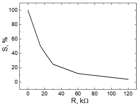 Following the development of the vibratory feeder automatic control system based on sinusoidal signal modification, comprehensive tests were conducted to assess its performance. Digital resistors, specifically potentiometers with variable resistance, were employed to regulate the partial opening of the PN junctions of the thyristor. These digital resistors were automatically controlled through the PIC controller program. To quantify the modification of the sinusoidal signal, particularly the residual area of the graph corresponding to positive values, an oscillometer was utilized. The degree of modification was expressed as a percentage. The variable resistance of the digital resistor ranged from 1 to 120 kΩ, and the PIC controller program adjusted it accordingly. The results of these experiments are depicted in Figure 8, showcasing the relationship between the percentage of the sinusoidal signal area and the control resistance of the thyristor.
