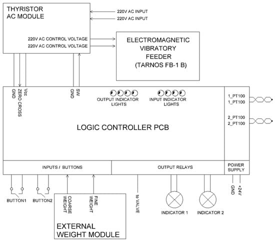An electronic system based on PIC microcontrollers was developed to automatically control the bulk production vibratory feeder. Peanuts as a transported material were chosen for testing the vibratory feeder. During the process, there was an approximate and accurate weighing of the dosed production using a system consisting of a hopper into which the production was poured, a scale and a production release valve. The weighting module is controlled by a discrete 20 V signal. For vibratory dosing, the TARNOS FB-1 B (vibratory feeder) module (Tarnos, Madrid, Spain) was used, which consists of two main components: an electromagnet and a mechanical spring system. The technical data of this module are: weight—9.5 kg, flow rate—2 tm/h, and amplitude—1.6 mm.
