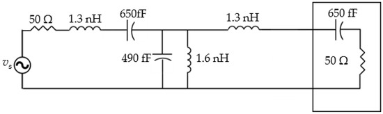 It is evident from (6) that efficient broadband impedance-matching structures inherently exhibit filter-like characteristics [23,24]. For optimal matching performance, all reflection coefficients |Γin(ω)| within the frequency band of interest are preferred to be small while |Γin(ω)| outside this frequency range are one (i.e., perfect reflection). So, the sharper the cut-off rate of the filter is, the better the performance of the IMN will be [25]. It is well known that the Chebyshev filter offers a sharper cut-off; therefore, it is chosen for comparison with the SRFT method. In [9], a UWB Chebyshev filter theory was used to design the IMN for a load modelled by a 50 Ω resistor in series with a 650 fF capacitor. The IMN comprises five components, with their values (from [9]) depicted in Figure 2. The reflection coefficient resulting from this design is shown in Figure 3, obtained by simulating the circuit in Figure 2 using the Cadence Virtuoso Spectre circuit simulator with ideal elements from the analog library.