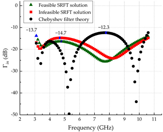 Reflection coefficient of the design using the Chebyshev filter theory (●) [9], the SRFT-based realizable solution (▲), and the SRFT-based unrealizable solution (■). The maximum Γin of each response is indicated by the blue color symbols.