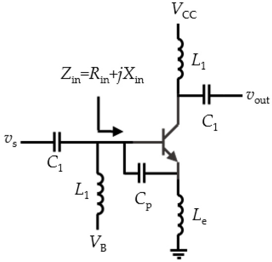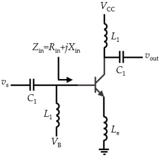 Assuming the antenna provides a source impedance ZS = 50 Ω in the frequency band of interest, the improved SRFT can find an IMN to match a load ZL to the 50 Ω source impedance, as shown in Figure 1. The inductor-degenerated topology is a commonly used technique [33] for amplifiers using bipolar junction transistors (BJT) [34] and field-effect transistors (FET) [35]. Figure 5 shows the frequently used common emitter amplifier with a degeneration inductor Le to obtain the required input resistance for narrowband [34] and wideband matching [10]. Here, C1 serves as a DC blocking capacitor, and L1 is an RF choke to isolate the biasing circuit from the RF port. We demonstrate the designs of the input matching networks based on the improved SRFT for different bias conditions and circuit topologies using GlobalFoundries 90 nm BiCMOS technology.