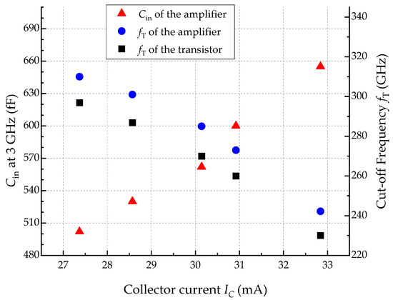 To further reduce the power consumption, Cin is to be established by adding a capacitor Cp in parallel at the amplifier input, as shown in Figure 7. Incorporating Cp mitigates variations in Rin with respect to frequency as it is placed in parallel with the intrinsic impedance of the transistor. This arrangement brings Rin closer to 50 Ω. When reducing the collector current IC, we adhere to two essential criteria: (1) ensuring that the IMN remains below −10 dB across the bandwidth and (2) maintaining the circuit’s fT above 100 GHz to ensure a circuit bandwidth up to 10.6 GHz. Cp and Le are adjusted to ensure that Zin and fT meet these requirements. Figure 8 shows the equivalent Cin at 3 GHz, the cut-off frequencies fT of the transistor and the amplifier (with Le in the range of 60–140 pH) at different collector currents IC. It is observed that, although adding Cp decreases the fT of the amplifier, we can further reduce the collector current IC to 6.1 mA. When comparing with the initial IC = 32.8 mA, we observe an 81.3% reduction in collector current while maintaining the fT at around 100 GHz to ensure the amplifier operates at 10.6 GHz. A further decrease in the collector current IC would yield a circuit with a reduced fT or Γin surpassing −10 dB. Table 1 shows the component values of the IMN, Cp, and Le for the bias conditions of the base-to-emitter voltage VBE and the collector current IC in Figure 8.