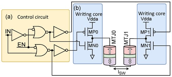Conventional STT p−MTJ write circuit, consisting of (a) control circuit and (b) writing core. Bi-directional flows through the MTJ pair to switch its state between P and AP.