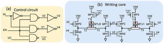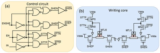 Schematic of SHE+STT p-MTJ write circuit consisting of (a) control circuit and (b) writing core.