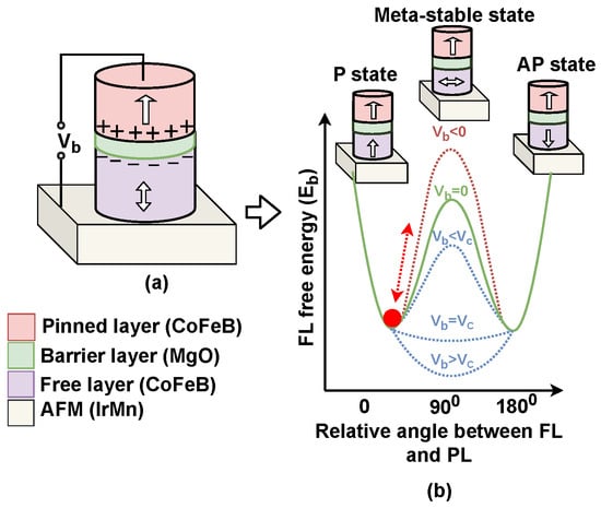 One significant method to overcome the ohmic loss and joule heating effect is incorporating the voltage to switch the p-MTJ status. Recent literature reveals that applying a voltage across p-MTJ can alter its magnetic anisotropy [37,38,39,40]. This effect is called voltage-controlled magnetic anisotropy (VCMA). The VCMA effect can switch the MTJ status. However, achieving deterministic MTJ switching with the VCMA effect requires either a precise voltage pulse or external assistance from a magnetic field or a small STT/SHE current. Since generating a precise voltage pulse or producing an external magnetic field in practical conditions is challenging [41,42], some circuits were developed with two terminal p-MTJs with VCMA+STT switching regime [42,43,44]. However, applying STT current poses the disadvantages of dielectric breakdown and read disturbance errors. Given this, a combination of VCMA in conjunction with SHE is employed to switch the MTJ status deterministically. Hence, a new type of p-MTJ switching regime called VG+SOT has been developed that combines the advantages of VCMA and SHE [45,46,47,48]. The VG+SOT p-MTJ is formed by mounting the combination PL/BL/FL on top of antiferromagnetic material (AFM) such as IrMn3 [49,50] as shown in the Figure 4a. The AFM material in VG+SOT p-MTJ generates SOT and provides an in-plane exchange bias (). However, the developed here is weak. Hence, the SOT alone can not switch the MTJ deterministically. Nevertheless, with assistance from the VCMA effect, the SOT generated can accurately switch the FL’s magnetic orientation in VG+SOT p-MTJ [30,51]. VCMA effect is generated by applying a small voltage (), greater than or equal to the critical voltage () across the p-MTJ that lowers the energy barrier () (Figure 4b). This initiates a free precession of FL’s magnetic orientation. At the same time, a SHE current is forced through AFM to fix the FL’s magnetic orientation in a specific direction, i.e., either to P and AP. It is noteworthy that applying a negative increases . The relationship between is modeled as a function of and given in the Equation (1) as,