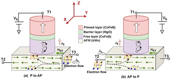 Figure 5 presents the VG+SOT p-MTJ switching mechanism. Consider switching VG+SOT p-MTJ from P to AP state. Here, the unpolarized in-plane electrons () are forced through the AFM in the −Y direction. Due to a strong spin orbit coupling (SOC), SHE is observed in the AFM, which results in the deflection of opposite spin electrons (which are in direction) in transverse, direction creating a spin current in Z-direction. Hence, there is an accumulation of electrons (oriented in −X direction) at the interface of AFM/FL. This exerts SOT to tilt the FL’s magnetic orientation from the Z-direction toward the XY-plane. The presence of in-plane causes the FL’s magnetic orientation to precessionally rotate around the field and move toward the direction of (here it is Y-direction) by damping action. Meanwhile, the application of VCMA would lower the to switch the FL’s magnetic orientation towards the −Z-direction. Hence, the MTJ switches from AP to P state. Similarly, the switching of the MTJ from P to AP is achieved by reversing the direction of (Figure 5b).