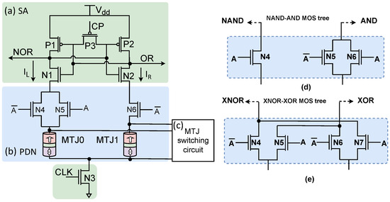 Circuit for NOR−OR gate based on IMC showing (a) SA, (b) PDN for NOR-OR logic gates and (c) MTJ switching block. Use MOS tree from (d,e) to obtain NAND−AND and XNOR−XOR respectively. Here two terminal p−MTJs are shown for STT logic gates. Replace them by three terminal MTJs to get SHE+STT/VG+SOT logic gates.