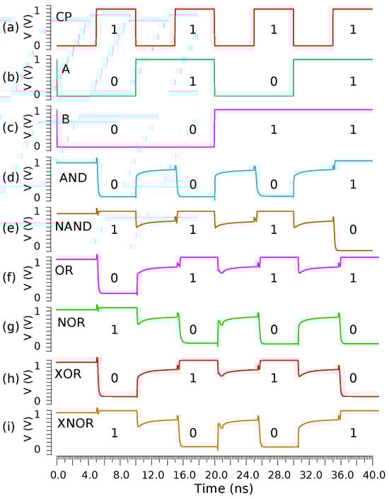 Simulated waveform for various hybrid logic gates showing inputs (a) CP, (b) A, (c) B and corresponding outputs (d) AND, (e) NAND, (f) OR, (g) NOR, (h) XOR, (i) XNOR.