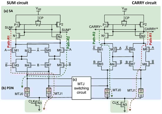 NV-FA based on IMC consisting of (a) SA (b) PDN for SUM and CARRY circuit with (c) MTJ switching block. Here two terminal STT p−MTJ are shown for STT NV−FA. By replacing them with three terminal SHE+STT/VG+STT p−MTJs we can obtain SHE+STT/VG+SOT NVFA circuit.