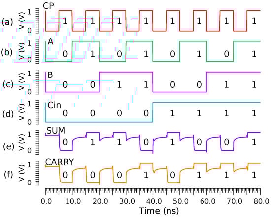 Having developed all the logic gates, we developed NV-FA based on IMC architecture with different types of MTJs shown in Figure 9. The working of this FA is in line with the IMC based logic gates, where there are two operating phases: pre-charge and evaluation. In the pre-charge (CP = 0), all the outputs, sum (SUM) and its complement (SUM), and carry (CARRY), and its complement (CARRY) are at logic 1 (Vdd-Vth). Meanwhile, input A, B, and are applied to the PDN. During the evaluation (CP = 1), these inputs are processed to produce outputs (SUM/SUM and CARRY/CARRY). Imagine the inputs applied in the pre-charge phase are A = 1, B = 0, and = 0. During the evaluation phase, both in SUM and CARRY circuits, there are two routes, Path-R1 and Path-R2, from their respective nodes to the GND. This is because, in the PDN of the SUM circuit, transistors M1, M3, M6, and M8 are ON, whereas the other transistors are OFF. The Path-R1 is via SUM-N1-M1-M3-MTJ1-N3-GND. Path-R2 is via SUMN2-M6-M8-MTJ0-N3-GND. As = 0, the MTJ pair is in AP-P state. So, the total resistance in Path-R1 < Path-R2. Hence, the SUM node is pulled down to GND, and the SUM node is pulled up to Vdd. Therefore, SUM = 1 and SUM = 0. Similarly, in the carry circuit, the total resistance in Path-R1 < Path-R2. Path-R1 is via CARRYN1-M2-M4-MTJ0-N3-GND, and Path-R2 is via CARRY-N2-M6-M8-MTJ1-N3-GND. So the CARRY = 0 and CARRY = 1. Likewise, the working of NV-FA for other input combinations can be realized. Figure 10 shows the timing diagram of the IMC based NV-FA for a clock frequency of 100 MHz.