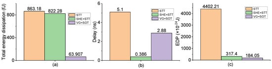 The dynamic power dissipation of the VG+SOT based NV-FA is least followed by SHE+STT and STT based NV-FA. VG+SOT based NV-FA consumes 70.29% and 71.98% lower dynamic power than SHE+STT and STT NV-FAs, respectively. The total power dissipation of VG+SOT based NV-FA is least followed by SHE+STT and STT. VG+SOT NV-FA dissipates 2.93% and 4.26% lower power than SHE+STT and STT NV-FA, respectively. The worst case read delay of STT based NV-FA is least followed by SHE+STT, and VG+SOT based NV-FAs. STT based NV-FA’s worst case read delay is 0.62% and 86.87% lower than SHE+STT and VG+SOT based NV-FA, respectively. The PDP SHE+STT NV-FA is least followed by STT and VG+SOT. The PDP of SHE+STT NV-FA is 0.78% and 86.4% lower than STT and VG+SOT based NV-FAs respectively. The reason for the increased read delay and PDP is the same as that of VG+SOT logic gates discussed in the previous section. Figure 15 shows the bar chart plot of the dynamic, total power dissipation, worst-case read delay, and PDP for various NV-FA circuits.