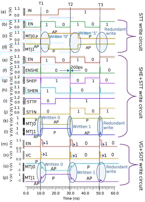 Simulated waveform for (b–d) STT, (e–l) SHE+STT and (m–p) VG+SOT write circuits. The input data (a) IN is common whereas the other enable signals and switching of the MTJ pairs for the different write circuits are shown separately.