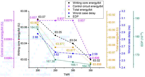 We have investigated the effect of TMR variation on the VG+SOT write circuit parameters, as shown in Figure 13. Here, we have increased the TMR from 200 to 350 in steps of 50. Notice that as the TMR value increases, the total energy/bit, worst case delay, and EDP decreases slightly. Hence, we can say achieving a higher TMR is vital for the design of efficient hybrid circuits.