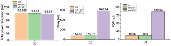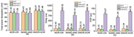 We can observe that total power dissipation in all the logic gates is the least with VG+SOT logic gates, followed by SHE+STT and STT. However, the read delay of SHE+STT based logic gates is lower. This is because the IrMn3, AFM material in VG+SOT p-MTJ has higher resistivity, i.e., 278 µcm [30], whereas the Ta, HM material in SHE+STT p-MTJ has a lower resistivity of 190 µcm [57]. A higher resistivity of IrMn3 poses a higher resistance in the discharge current path with VG+SOT based logic gates, resulting in higher read delay. However, we know that based on the inputs, during the evaluation phase, one of the outputs (either OUT or OUT) is discharged to GND, whereas the other one is raised to Vdd. Here, the value of OUT and OUT is constant, whereas the discharge path resistance of VG+SOT is more due to the higher resistivity of AFM. Hence, we observe a lower power dissipation with VG+SOT circuits. Nevertheless, a higher delay causes a larger PDP with VG+SOT based logic gates. Figure 14 shows the bar chart plot of the dynamic, total power dissipation, worst-case read delay, and PDP for various logic gates circuits.