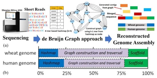 (a) The de Bruijn graph-based genome assembly process, (b) break down of execution time of Meraculous genome assembler for human and wheat datasets [2,4].