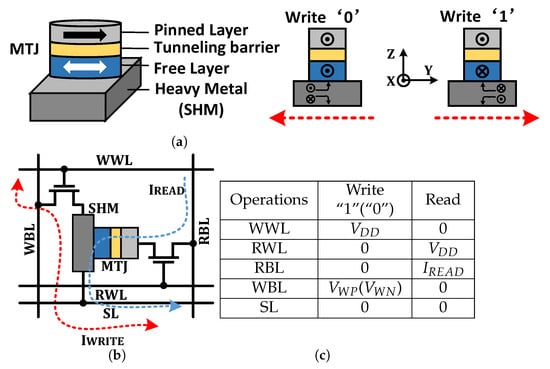 Figure 2a shows the spin–orbit torque magnetic random-access memory (SOT-MRAM) device structure used in this work. The storage element in SOT-MRAM is SHE-MTJ [32], a composite device structure of Spin Hall Metal (SHM) and Magnetic Tunnel Junction (MTJ). The binary data are stored as resistance states of MTJ. Data-“0”(/“1”) are encoded as the MTJ’s lower (/higher) resistance or parallel (/anti-parallel) magnetization in both magnetic layers (free and fixed layers). Here, the flow of charge current (±y) through the SHM (Tungsten, [33]) will cause the accumulation of oppositely directed spin on both surfaces of the SHM due to spin Hall effect [32]. Thus, a spin current flowing in ±z is generated and further produces spin–orbit torque (SOT) on the adjacent free magnetic layer, causing a switch of magnetization. Each cell located in the computational sub-array is connected with a Write Word Line (WWL), Write Bit Line (WBL), Read Word Line (RWL), Read Bit Line (RBL), and Source Line (SL). The bit-cell structure of 2T1R SOT-MRAM and its biasing conditions are shown in Figure 2b and Figure 2c, respectively.