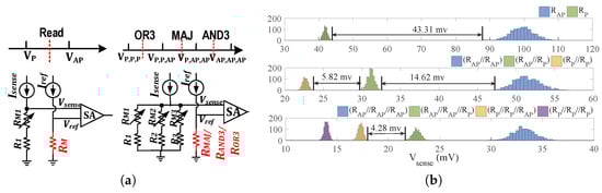 (a) Reference comparison to realize in-memory operations, (b) Monte Carlo simulation of Vsense.