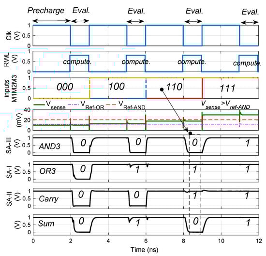 During the precharge phase of SA (Clk = 1), ±Vwrite voltage is applied to the WBL to change the MRAM cell resistance to Rlow = 5.6 k or Rhigh = 15.17 k. Prior to the evaluation phase (Eval.) of SA, WWL and WBL are grounded, while RBL is fed by the very small sense current, = 3 A. In the evaluation phase, RWL goes high and, depending on the resistance state of parallel bit-cells and, accordingly, SL, Vsense is generated at the first input of SAs when Vref is generated at the second input of SAs. A voltage comparison between Vsense and Vref for AND3 and OR3 and the output of SAs are plotted in Figure 5. For example, we observe only when Vsense > Vref,AND (M1M2M3 = 111), the SA-III outputs binary “1”, whereas the output is “0” . Figure 5 also shows the in-memory XOR3 function (Sum) accomplished in a single memory cycle through three SA outputs.